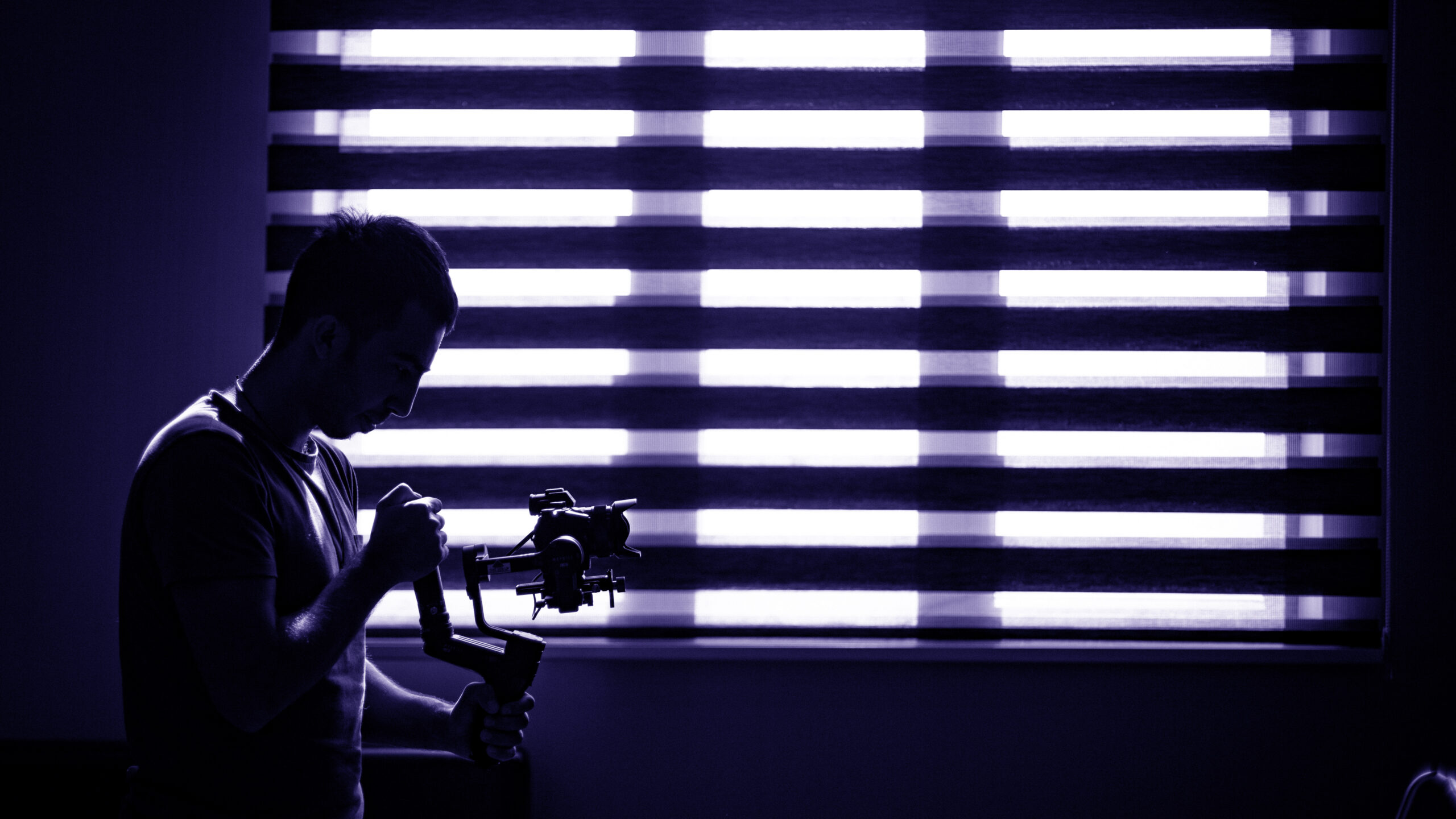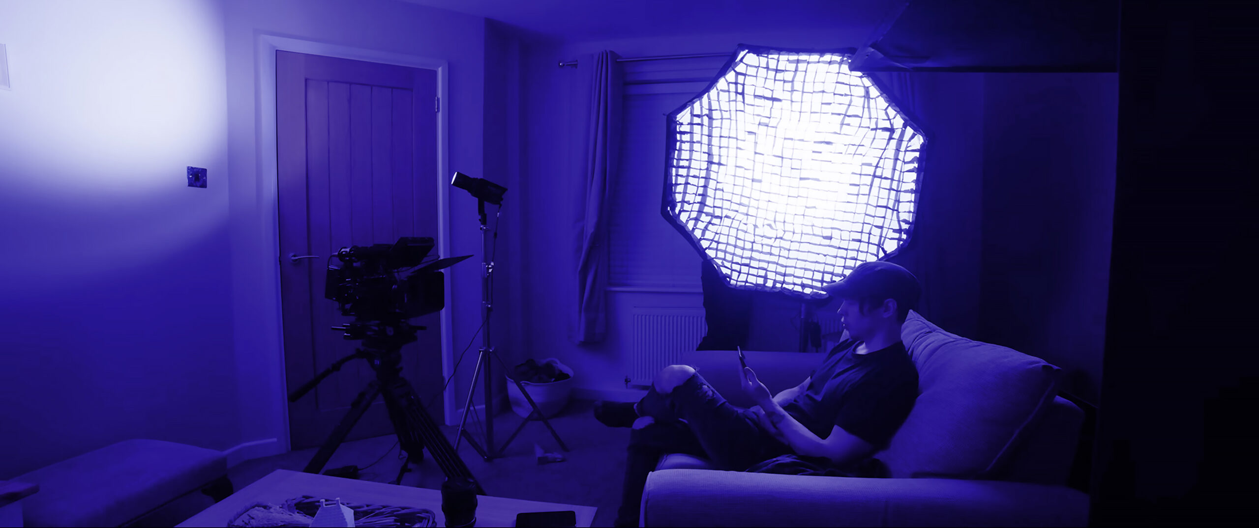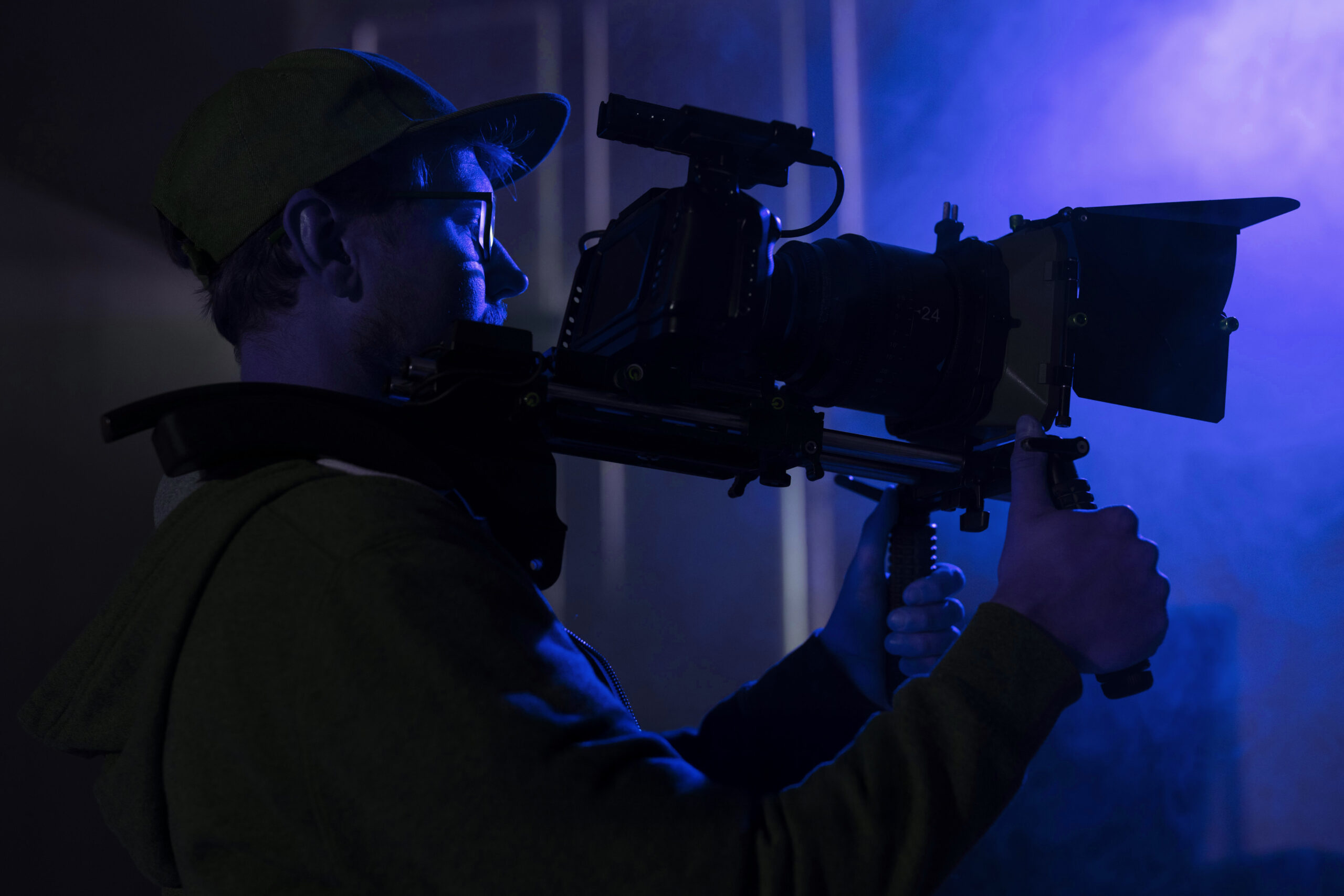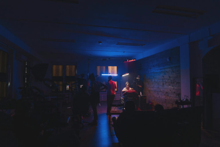 This image captures a behind-the-scenes moment on a dimly lit production set, where a crew is focused on a seated subject near a wood-paneled wall. The entire scene is bathed in stylized, cinematic lighting, dominated by a deep blue wash that contrasts sharply with vibrant red vertical light tubes. Dark silhouettes of people and equipment in the foreground create depth, emphasizing the focused, moody, and creative atmosphere of the shoot.
