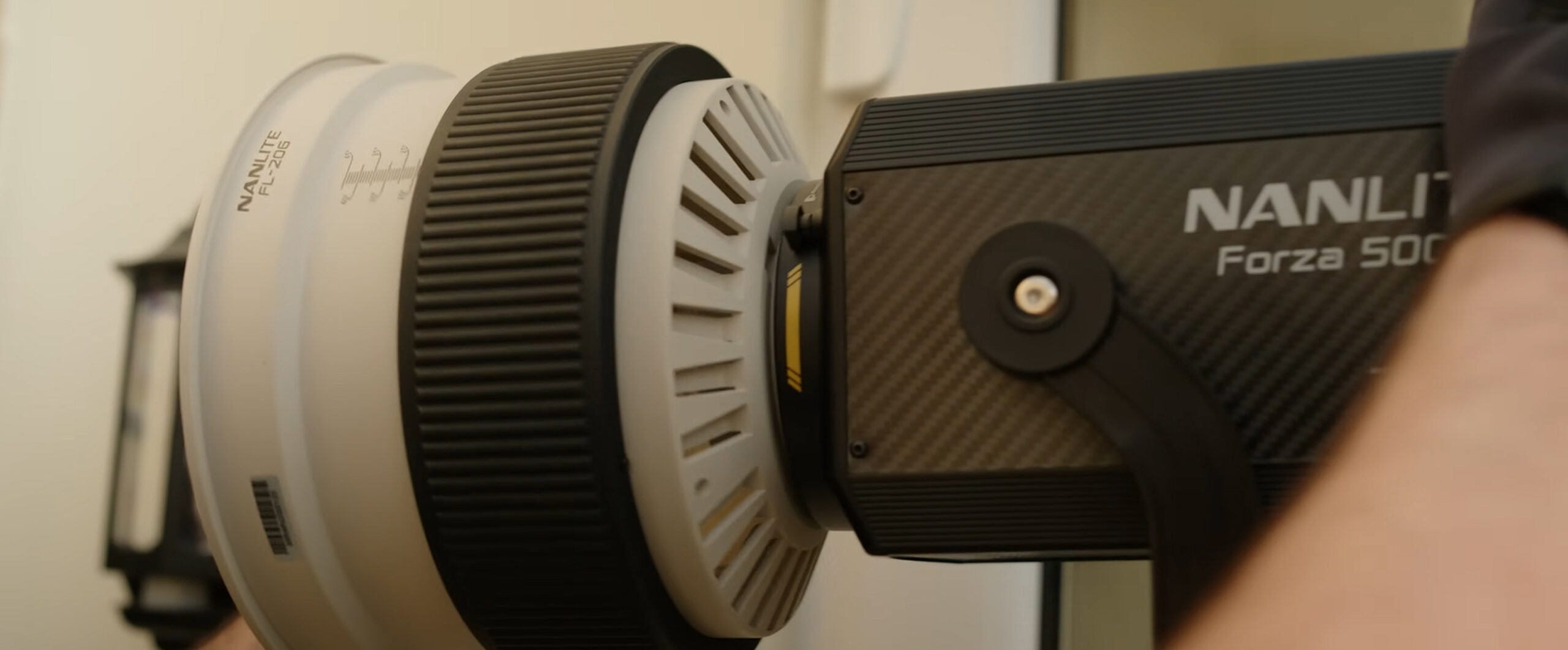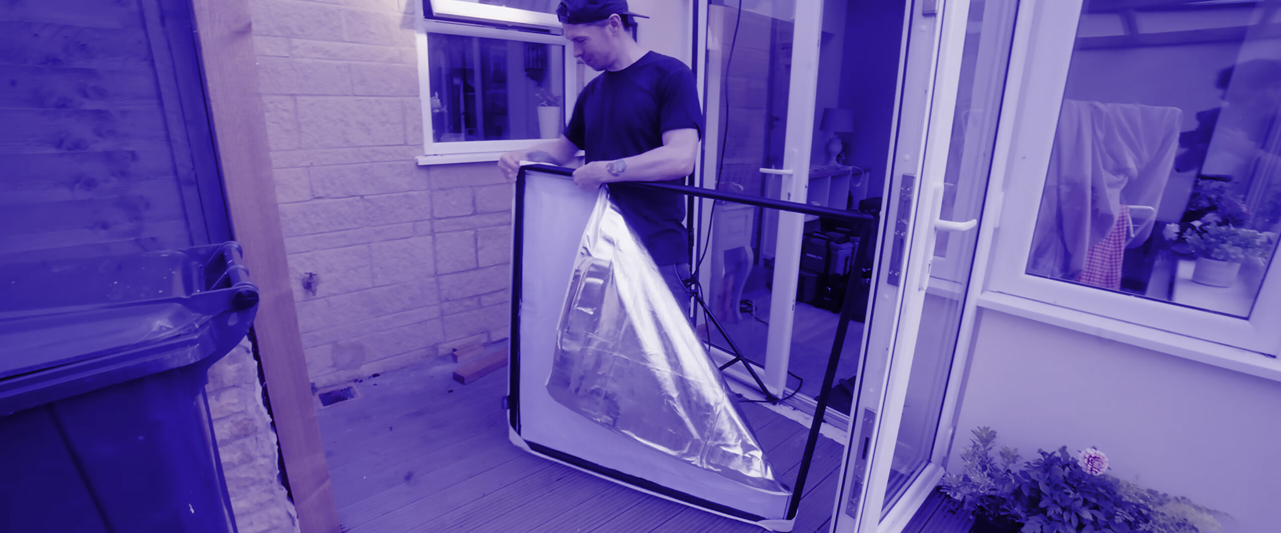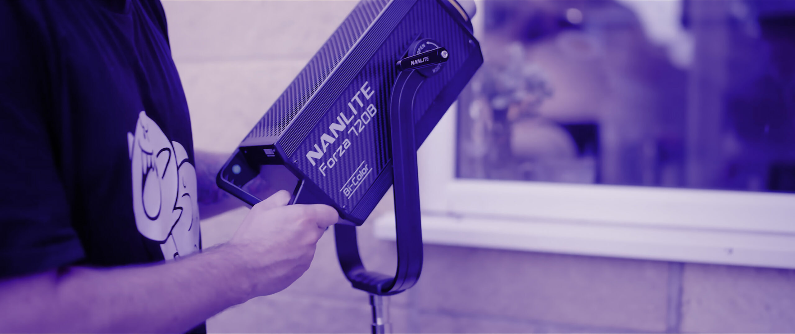 This image captures a behind-the-scenes moment on a dimly lit production set, where a crew is focused on a seated subject near a wood-paneled wall. The entire scene is bathed in stylized, cinematic lighting, dominated by a deep blue wash that contrasts sharply with vibrant red vertical light tubes. Dark silhouettes of people and equipment in the foreground create depth, emphasizing the focused, moody, and creative atmosphere of the shoot.