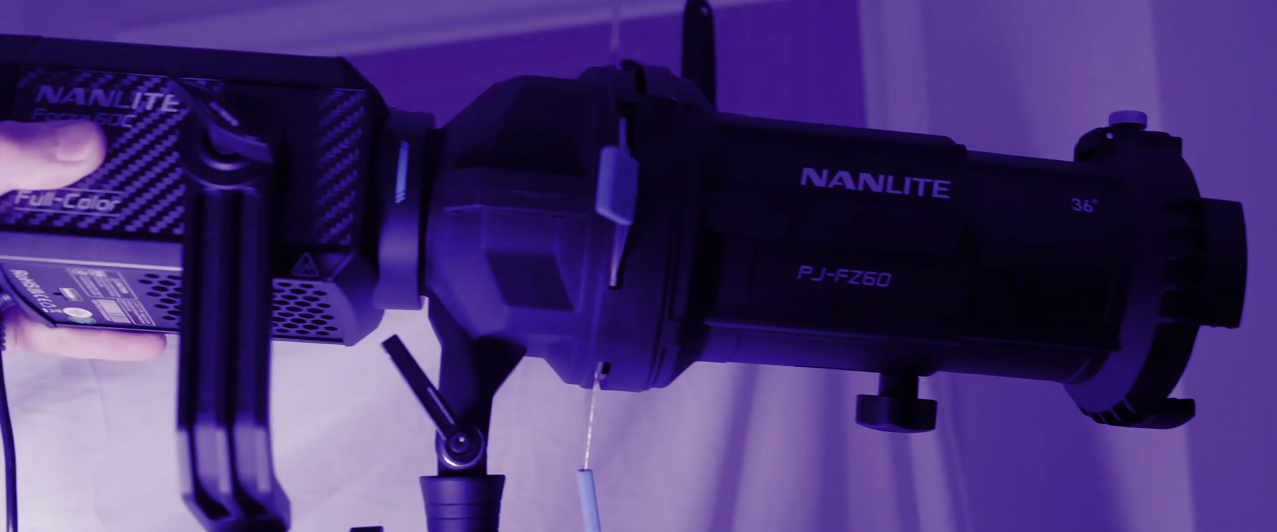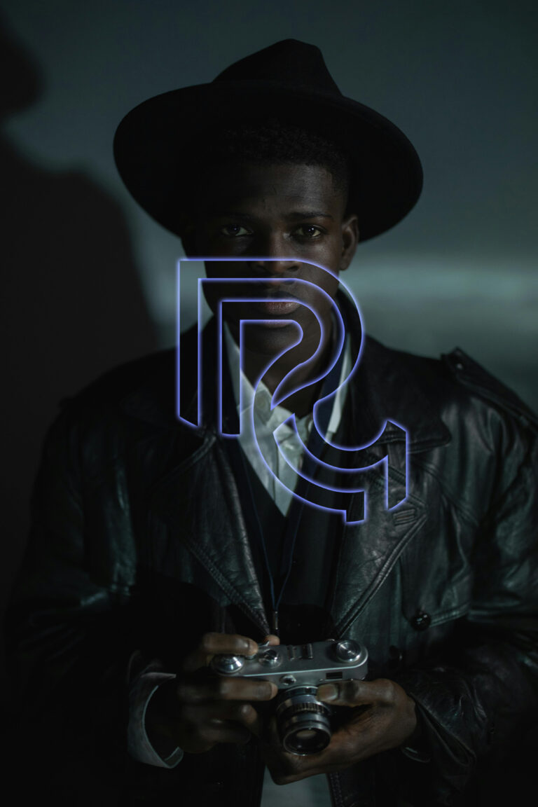 This moody, low-key portrait features a man in film noir-inspired attire, wearing a fedora and trench coat while holding a vintage camera. His intense gaze is directed at the viewer, enhanced by dramatic lighting and deep shadows that create a mysterious atmosphere. A glowing blue neon monogram is strikingly superimposed over the subject, blending a classic aesthetic with a modern graphic element.